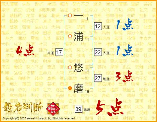 一浦悠磨さんの総運は39画の5点!
