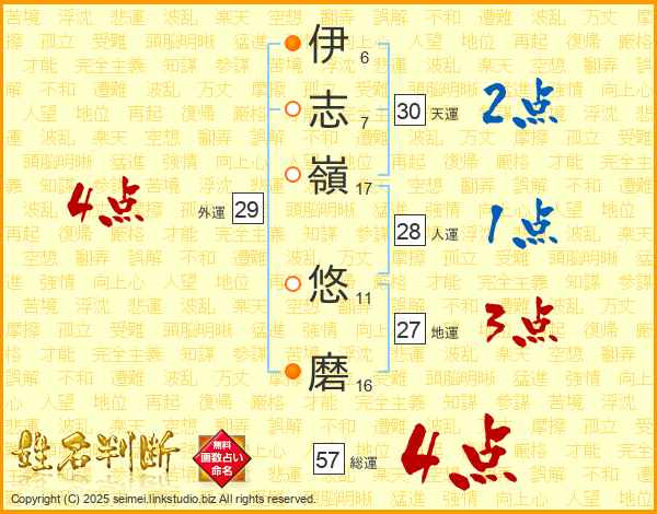 伊(6画)志(7画)嶺(17画) 悠(11画)磨(16画)