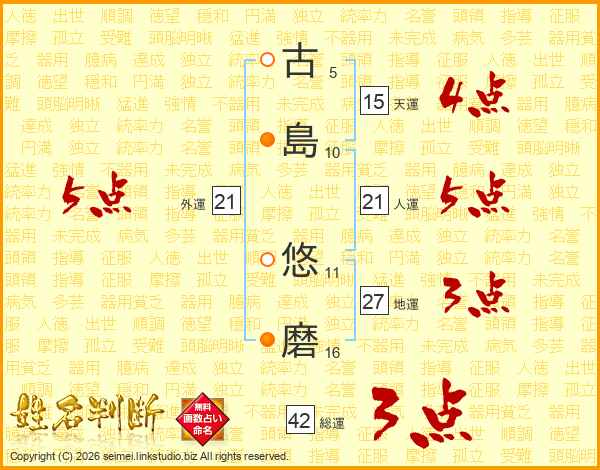 あなたの人生を表す1番重要な運勢です。生涯を通じて影響する総合運となり、主に50歳以降の晩年期に影響を及ぼします。苗字と名前の合計画数。