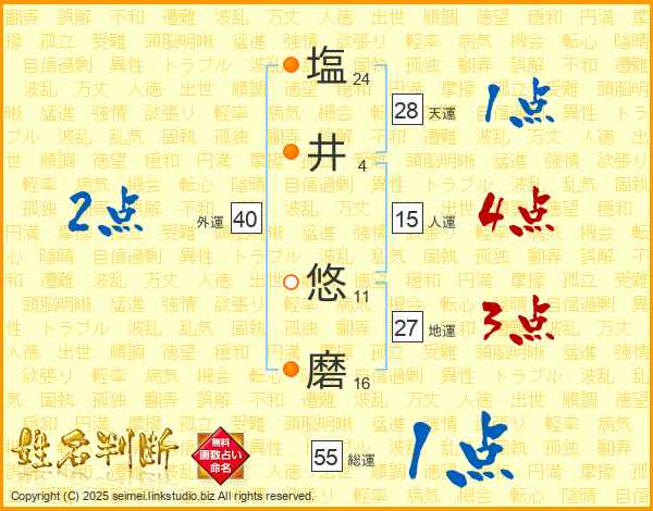塩(24画)井(4画) 悠(11画)磨(16画)