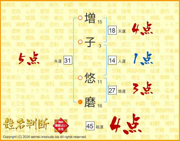 増(15画)子(3画) 悠(11画)磨(16画)