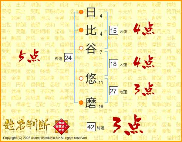 日(4画)比(4画)谷(7画) 悠(11画)磨(16画)