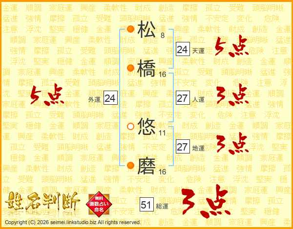 松(8画)橋(16画) 悠(11画)磨(16画)