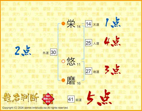 栄(14画) 悠(11画)磨(16画)