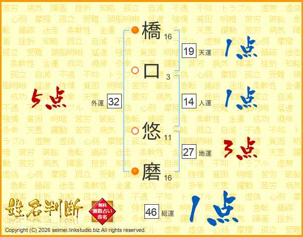 橋(16画)口(3画) 悠(11画)磨(16画)