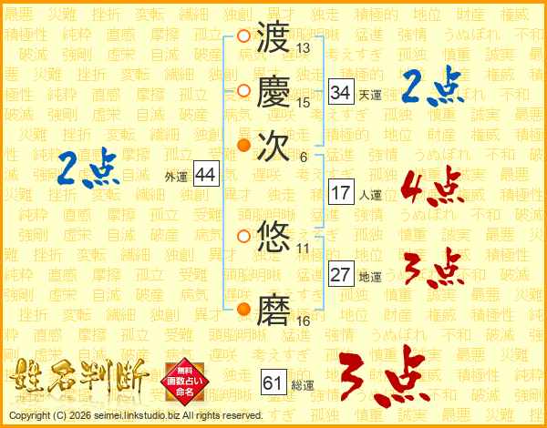 渡(13画)慶(15画)次(6画) 悠(11画)磨(16画)