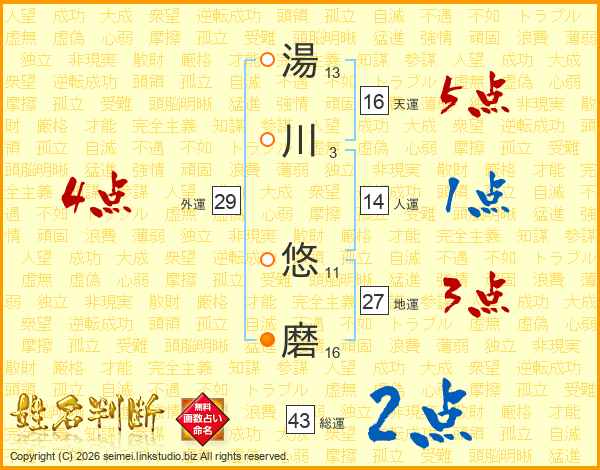 湯(13画)川(3画) 悠(11画)磨(16画)