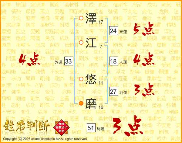 澤(17画)江(7画) 悠(11画)磨(16画)