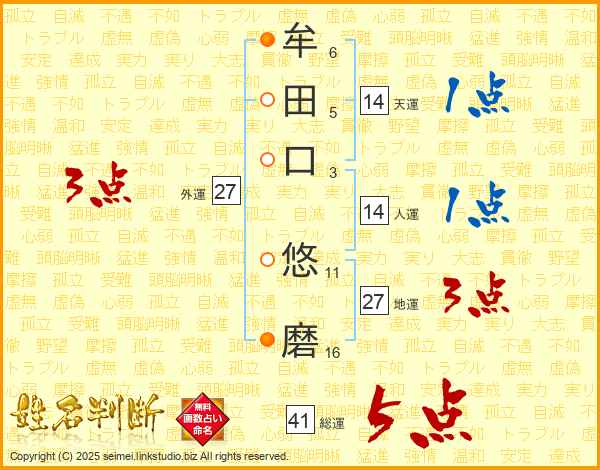 牟(6画)田(5画)口(3画) 悠(11画)磨(16画)