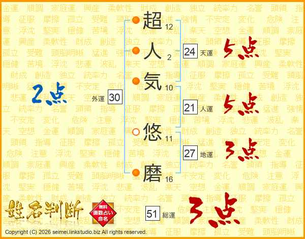 超(12画)人(2画)気(10画) 悠(11画)磨(16画)