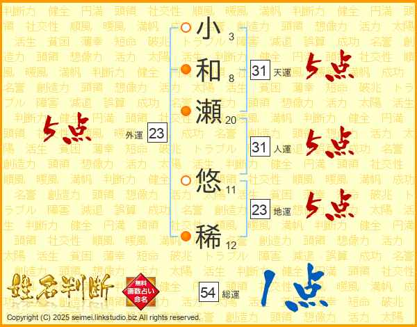 小(3画)和(8画)瀬(20画) 悠(11画)稀(12画)