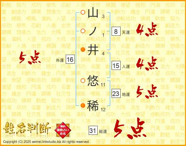 山(3画)ノ(1画)井(4画) 悠(11画)稀(12画)
