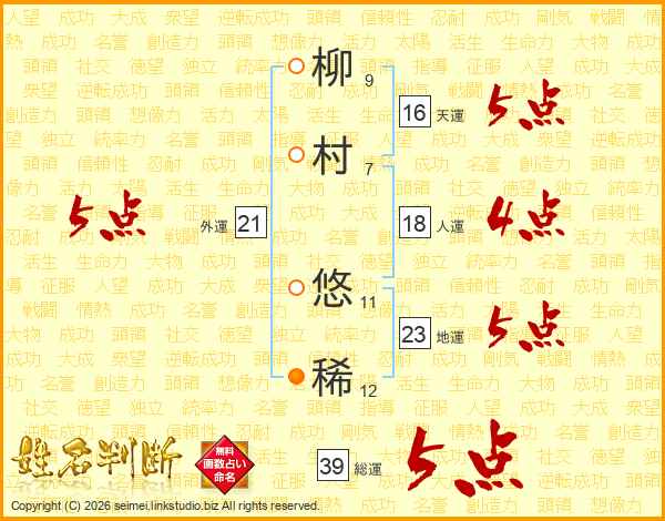 柳村悠稀さんの総運は39画の5点!