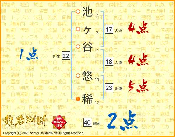 池(7画)ヶ(3画)谷(7画) 悠(11画)稀(12画)