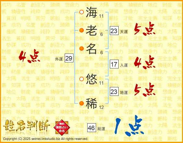 海(11画)老(6画)名(6画) 悠(11画)稀(12画)