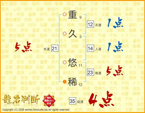 重(9画)久(3画) 悠(11画)稀(12画)