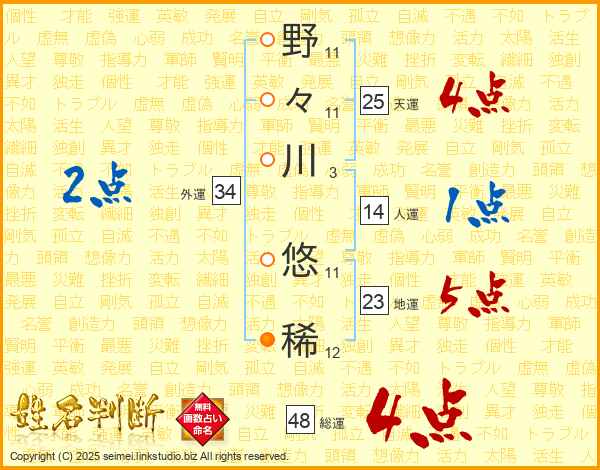 野(11画)々(11画)川(3画) 悠(11画)稀(12画)