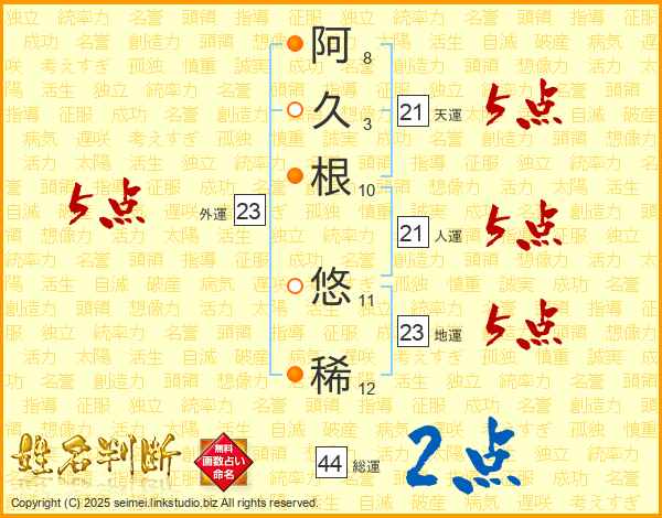 阿(8画)久(3画)根(10画) 悠(11画)稀(12画)
