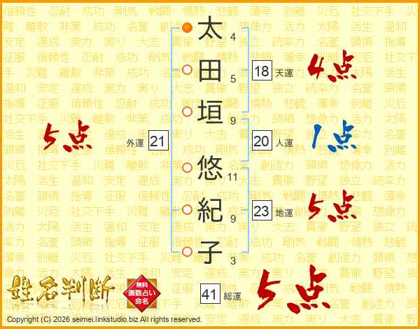 太(4画)田(5画)垣(9画) 悠(11画)紀(9画)子(3画)
