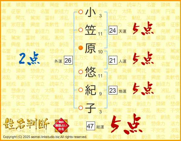 小(3画)笠(11画)原(10画) 悠(11画)紀(9画)子(3画)