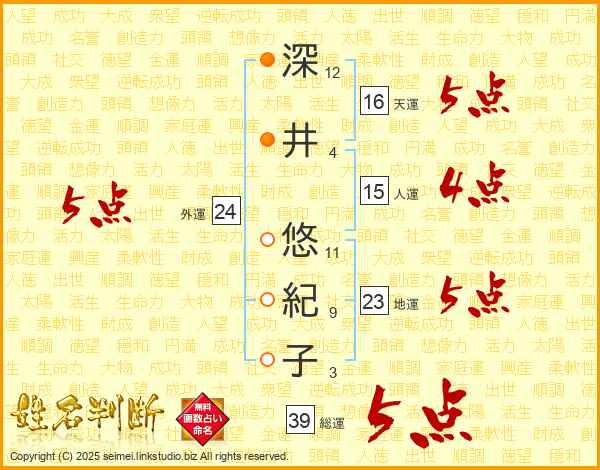 深(12画)井(4画) 悠(11画)紀(9画)子(3画)