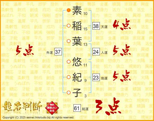 素(10画)稲(15画)葉(13画) 悠(11画)紀(9画)子(3画)