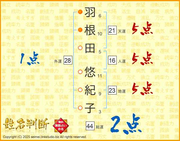 羽(6画)根(10画)田(5画) 悠(11画)紀(9画)子(3画)