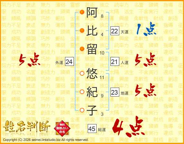阿比留悠紀子さんの総運は45画の4点!