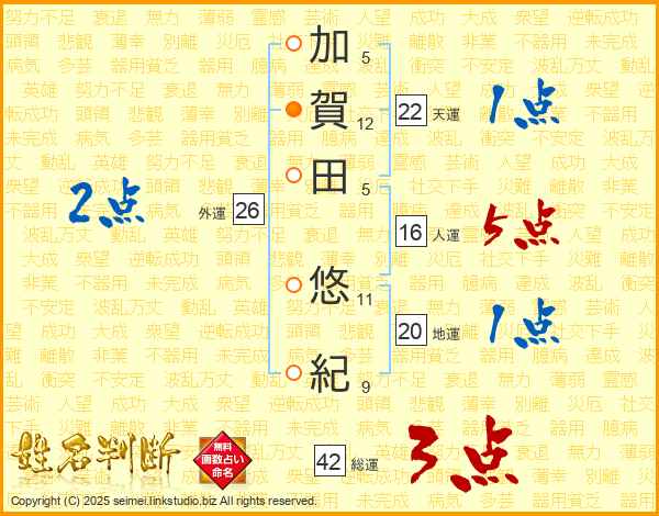 加(5画)賀(12画)田(5画) 悠(11画)紀(9画)