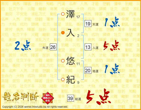 澤入悠紀さんの総運は39画の5点!
