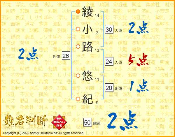 綾(14画)小(3画)路(13画) 悠(11画)紀(9画)