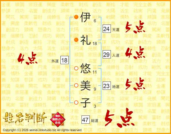 伊(6画)礼(18画) 悠(11画)美(9画)子(3画)