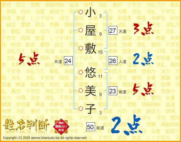 小(3画)屋(9画)敷(15画) 悠(11画)美(9画)子(3画)