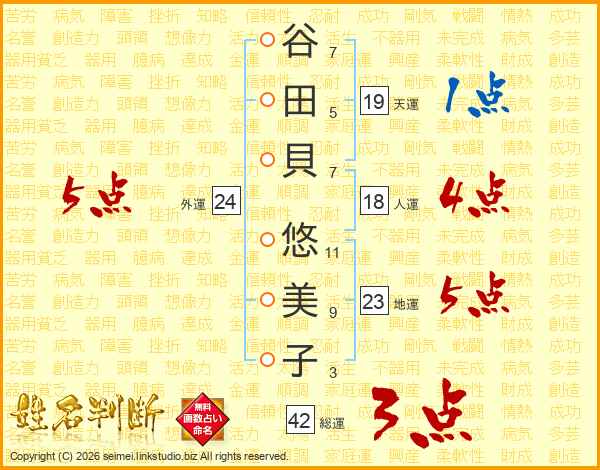 谷(7画)田(5画)貝(7画) 悠(11画)美(9画)子(3画)