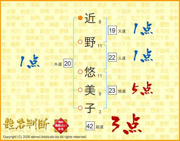 近(8画)野(11画) 悠(11画)美(9画)子(3画)
