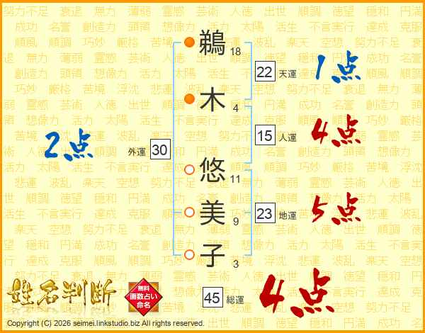 鵜(18画)木(4画) 悠(11画)美(9画)子(3画)