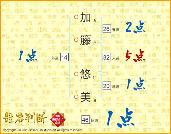生活面を象徴する運勢です。外部から受ける影響力を表し、結婚運、家庭運や職場、環境への順応性を表します。総運から人運を引いた画数。姓や名が1文字の場合を除く。