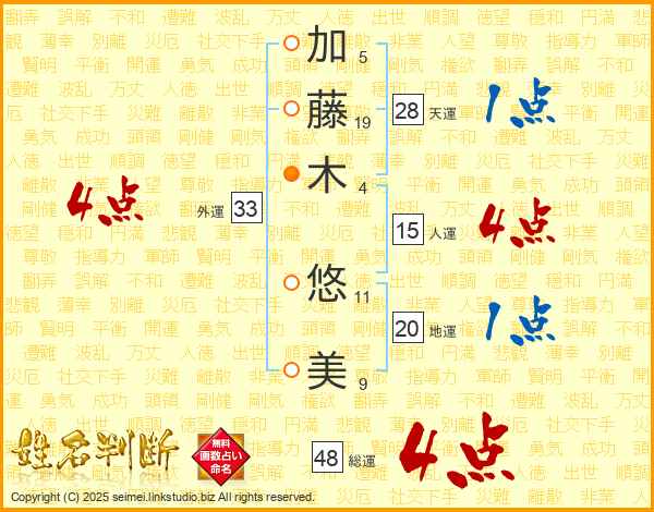 加(5画)藤(19画)木(4画) 悠(11画)美(9画)