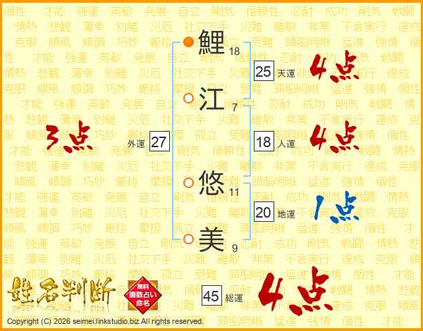 鯉(18画)江(7画) 悠(11画)美(9画)