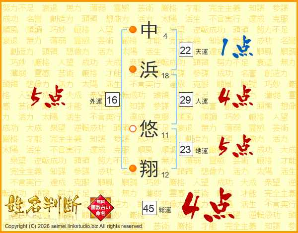 中(4画)浜(18画) 悠(11画)翔(12画)