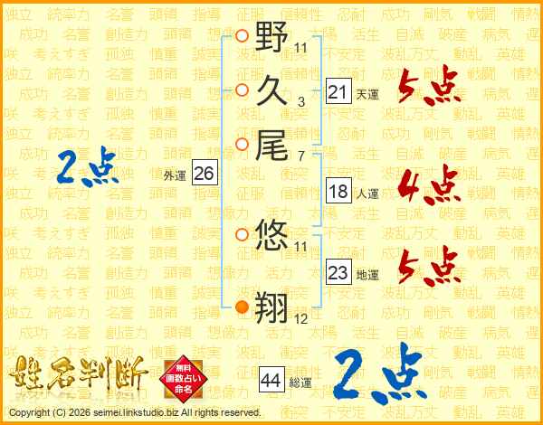 野(11画)久(3画)尾(7画) 悠(11画)翔(12画)