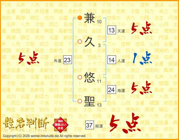 兼久悠聖さんの総運は37画の5点!