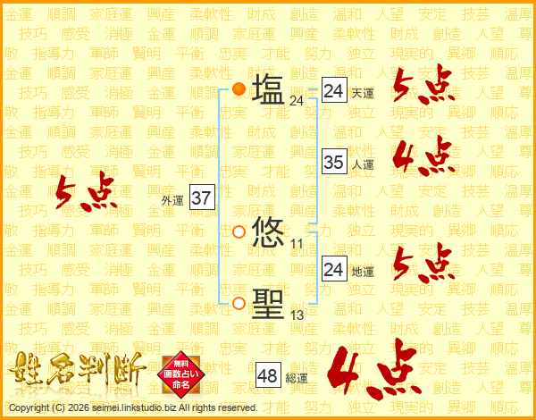 塩(24画) 悠(11画)聖(13画)
