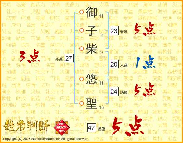御(11画)子(3画)柴(9画) 悠(11画)聖(13画)