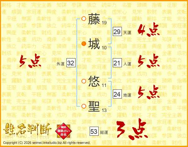 藤(19画)城(10画) 悠(11画)聖(13画)