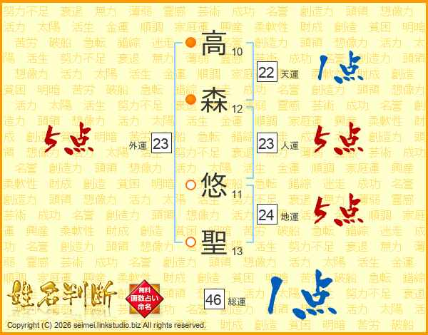 生活面を象徴する運勢です。外部から受ける影響力を表し、結婚運、家庭運や職場、環境への順応性を表します。総運から人運を引いた画数。姓や名が1文字の場合を除く。