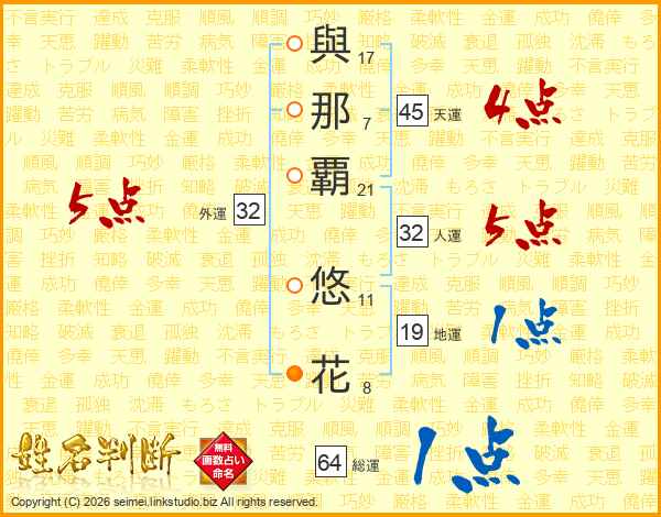 與(17画)那(7画)覇(21画) 悠(11画)花(8画)
