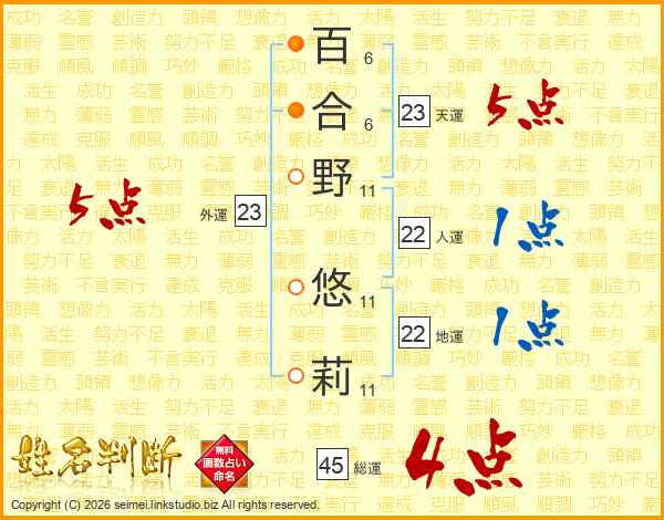百(6画)合(6画)野(11画) 悠(11画)莉(11画)