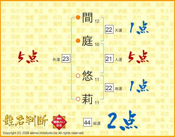 間(12画)庭(10画) 悠(11画)莉(11画)