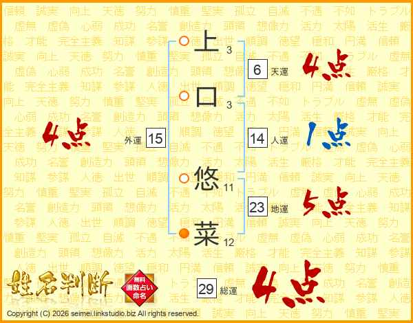 上口悠菜さんの総運は29画の4点!